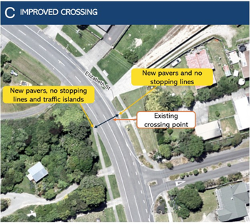 The existing courtesy crossing on the bend near the rest home will be upgraded to make it more visible and safer to use.