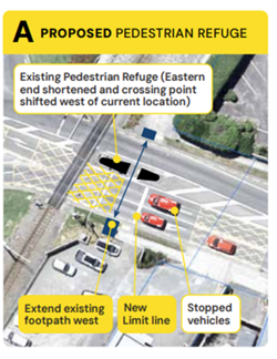 We’ll be improving pedestrian access near the traffic lights by installing new crossing ramps and shifting the stop line. This will allow people to safely use the existing refuge island without needing to walk between vehicles stopped at red lights.