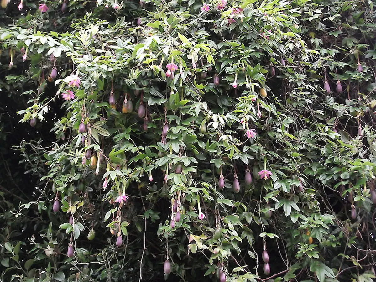 This high-climbing vine with single, hanging, tubular pink flowers can grow up to 10m high, maturing to fruit after only one year. The large, sweet fruit contain many seeds that are dispersed by birds, possums, rats and feral pigs.