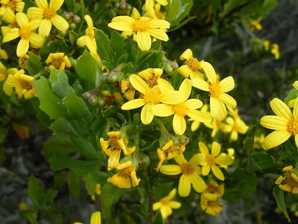 This bushy, semi-woody, many-branched shrub or small tree can grow to 2–3 metres. It produces bright yellow daisy-like flowers from September to February. These are followed by hard oval green fruit that ripen to black, each containing a hard seed.