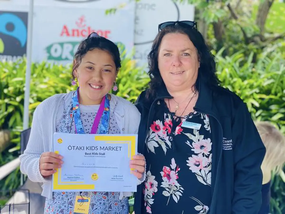 Image: Auroa won Best Kids' Stall at Ōtaki Market. Pictured here with Councillor Shelly Warwick.