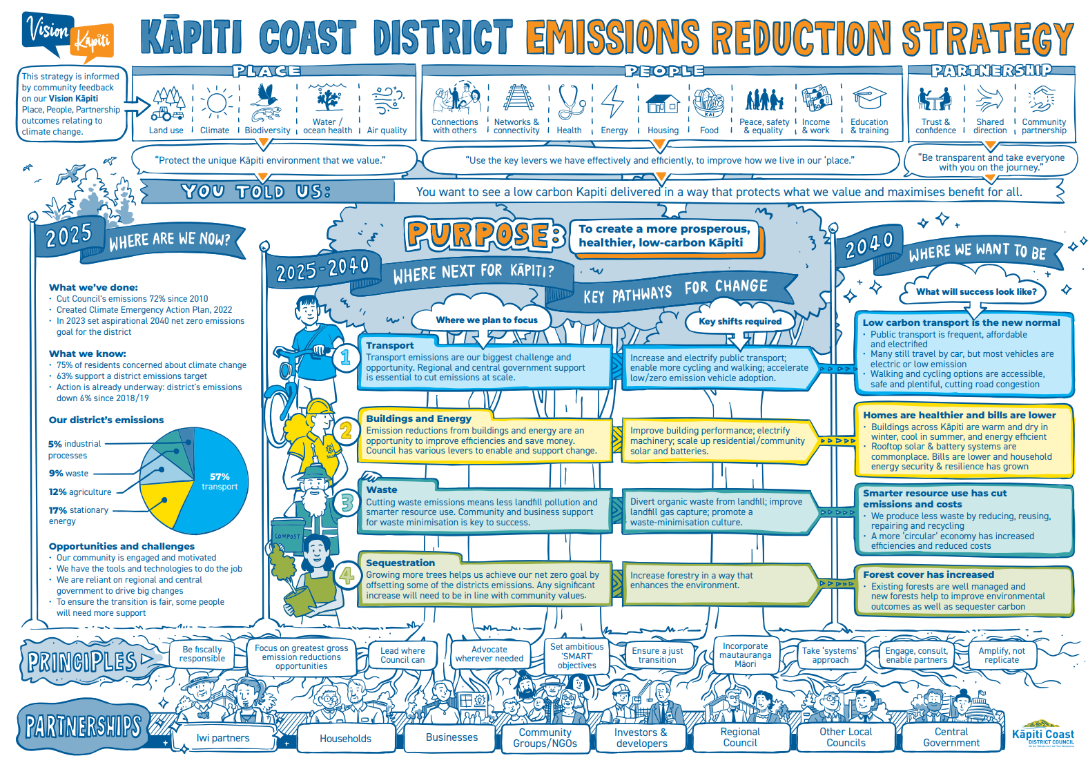This is a community strategy based on the feedback about what is most important for people in our district. Our residents have indicated that reducing emissions is an important way to contribute to reducing the impacts of climate change in an affordable and balanced way. Reducing emissions comes with many benefits, such as healthier homes and lower energy bills. In 2023, we consulted with community and agreed an aspirational goal of net zero emissions for the district by 2040. Our Emissions Reduction Strategy to achieve this aspirational goal is built on a model of working together and maximising the benefits of reducing emissions for everyone who lives and works in Kāpiti.