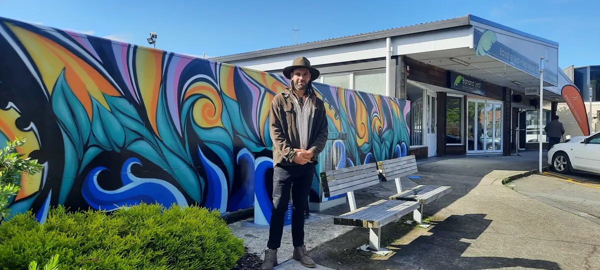 Kāpiti Artist Theo Arraj has created a mural commissioned by the Raumati Village Business Association with a grant from Kāpiti Coast District Council’s COVID-19 Recovery Fund for Arts. Grants from this fund were allocated to raise community resilience after lockdowns through art projects that encouraged local participation in the arts and increased the range and diversity of arts projects in the community.
