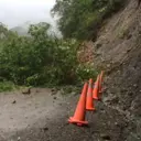 Wairongomai Road, Ōtaki - a gabion basket wall has slid so a drop is evident. Cones and signs are in place