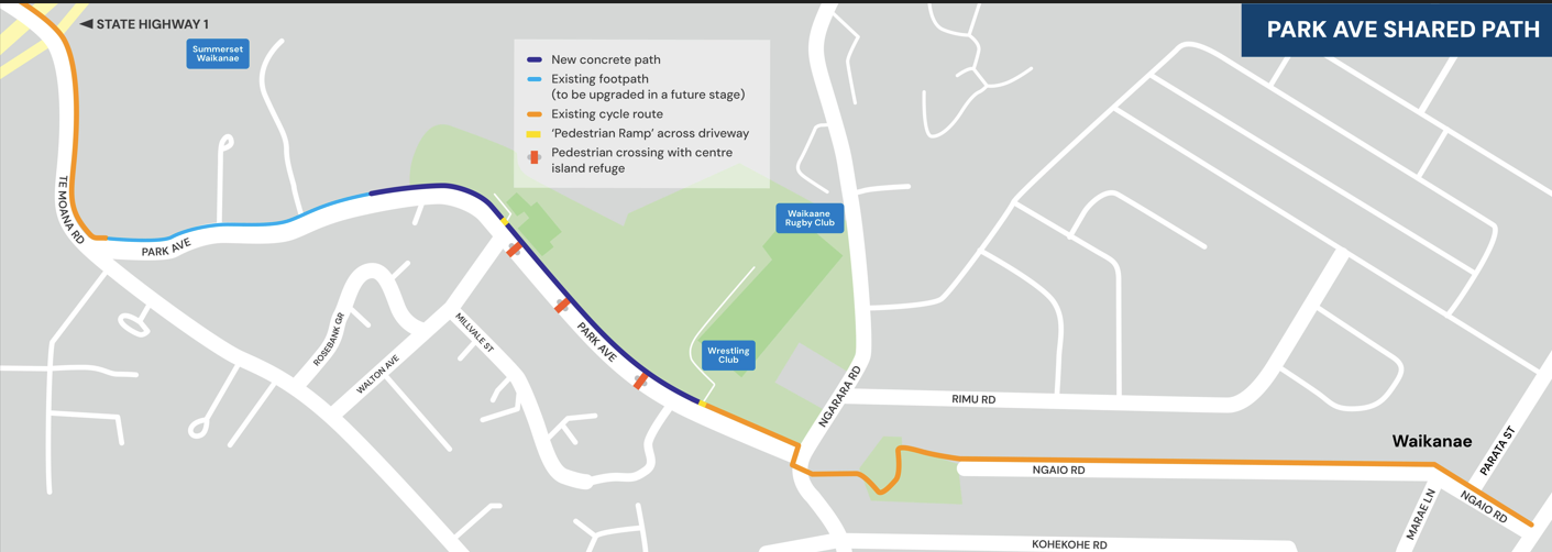 The project involves building a 645-metre-long shared concrete path on the northern side of Park Avenue from near number 44 Park Ave to the Wrestling Club carpark driveway.