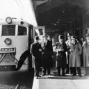 Railway officials beside the first standard railcar, Paekākāriki Railway Station, ca 1939. HP 1512 Buckley Collection, Kāpiti Coast District Libraries