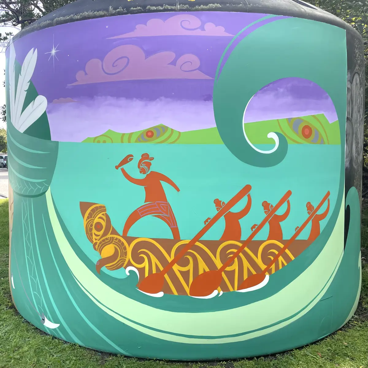 In this mural Kahe is seen standing strong between the stretch of water that is named after her, between Kāpiti and the mainland. This can be seen straight ahead if you were to walk along the beach where this mural sits. She leads the waka taua back to Kāpiti Island; in front of her is Ngāti Toa kaitiaki, the white ruru Kopa. She is adorned in red kōkōwai oil that protects her swimming and keeps her warm. Three feathers in her hair represent her Āti Awa whakapapa and the bright star on her left is a symbol, acknowledging her daughter Ripeka. Her earrings are mako teeth and the whakairo pattern on the waka is pūhoro, both representing speed, swiftness and agility.