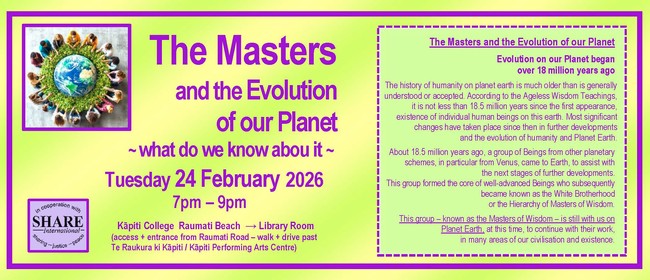The Masters and the Evolution of our Planet Evolution on our Planet began over 18 million years ago The history of humanity on planet earth is much older than is generally understood or accepted. According to the Ageless Wisdom Teachings, it is not less than 18.5 million years since the first appearance, existence of individual human beings on this earth. Most significant changes have taken place since then in further developments and the evolution of humanity and Planet Earth. About 18.5 million years ago, a group of Beings from other planetary schemes, in particular from Venus, came to Earth, to assist with the next stages of further developments; in the advancements of individualisation, mental capacity and other capabilities. This group formed the core of well-advanced Beings who subsequently became known as the White Brotherhood or the Hierarchy of Masters of Wisdom. This group – known as the Masters of Wisdom – is still with us – humanity – on Planet Earth, at this time, to continue with their work and assistance, in many areas of our civilisation and existence. The Situation Now This current time – our present time and existence – proves to be a time of many challenges, manifesting changes, upheavals – as it has been well documented. Humanity is faced and confronted with major significant decision-making choices and necessities – equal to moments of great opportunities. We as people on this planet Earth, a living being, together can make the ‘right decisions’ and choices – to create a future of peace, justice, harmony – for all. The choice is ours, ours alone. If accepted, the Masters will be able to openly assist humanity at this present time, again, to come to realise we have the capacity and ability to come to the right decisions – to create a better world for all. It is up to us. ~ followed by a short Transmission Meditation session ~ Share International New Zealand. Contact (021) 261 2749 Access - entrance from Raumati Road/ walk - drive past Te Raukura ki Kāpiti / Kāpiti Performing Arts Centre