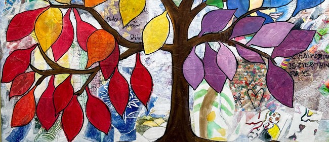 Art made by attendees of Te Ara Korowai, a creative wellbeing centre at Raumati Beach. Entry is free. The gallery is open Tuesday–Sunday, 10am–4pm. Image is a detail from Leaves of Change. This work has been created from the reclaimed artworks of our members collaged to form the base for the Te Ara Korowai tree emblem. It sits in a recycled frame. The colourful tree represents the strength, support and resilience derived from working together.