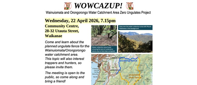 Wainuiomata and Orongorongo Water Catchment Area Zero Ungulates Project (WOWCAZUP) Come and learn about the planned ungulate fence for the Wainuiomata/Orongorongo water catchment area. This topic will also interest trappers and hunters, so please invite them. The meeting is open to the public, so come along and bring a friend!