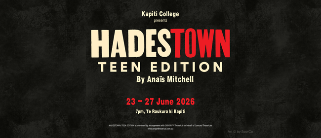 Kapiti College is excited to present Hadestown: Teen Edition, giving local audiences the opportunity to experience this internationally acclaimed musical live on stage. Hadestown: Teen Edition blends modern folk and jazz-inspired music with ancient Greek mythology. It follows Orpheus and Eurydice, a young couple trying to make things work in a tough world, alongside Hades and Persephone, who rule over a dark, industrial underworld. When Eurydice is pulled into that world, Orpheus risks everything to bring her back, relying on nothing but his music and his belief in her. It’s a story about love, hope, and the choices we make. The show is a huge team effort, with around 100 students involved. While many take the stage, others are working behind the scenes on lighting, sound, set design, and stage management. This helps to bring the entire production to life and gives students valuable experience both on and off stage. -- For accessibility seating information and wheelchair space bookings please email [email protected] or call 04)9740535 during office hours.