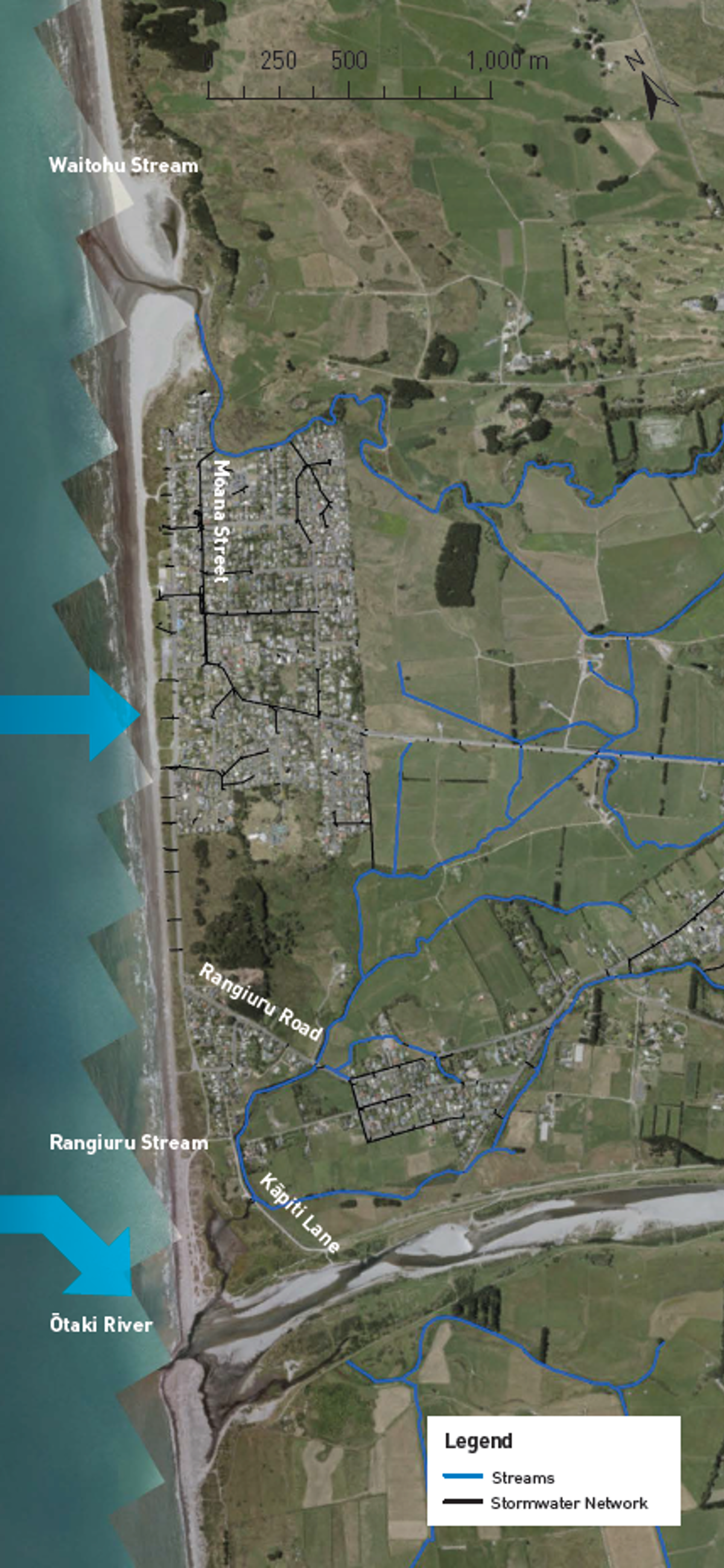 - For coastal flooding, the Ōtaki Beach settlement is generally well protected by sand dunes and the Rangiuru floodgates but is susceptible to flooding through pathways up the Waitohu and Rangiuru Streams.