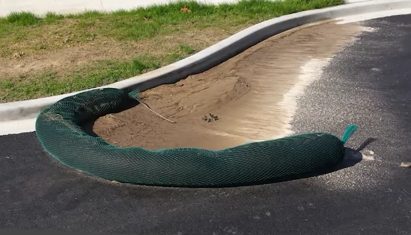 Silt socks are fabric tubes filled with gravel or mulch that are placed around stormwater drains or at site boundaries to help trap sediment and slow runoff before it enters the drainage system.