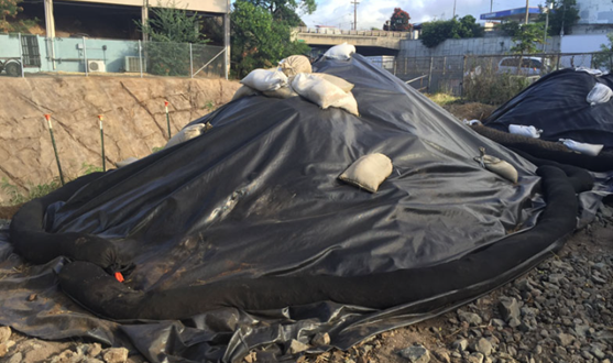- Or cover the stockpile with geofabric, plastic sheeting, or hay. These covers must be securely pinned down to prevent them from blowing away.