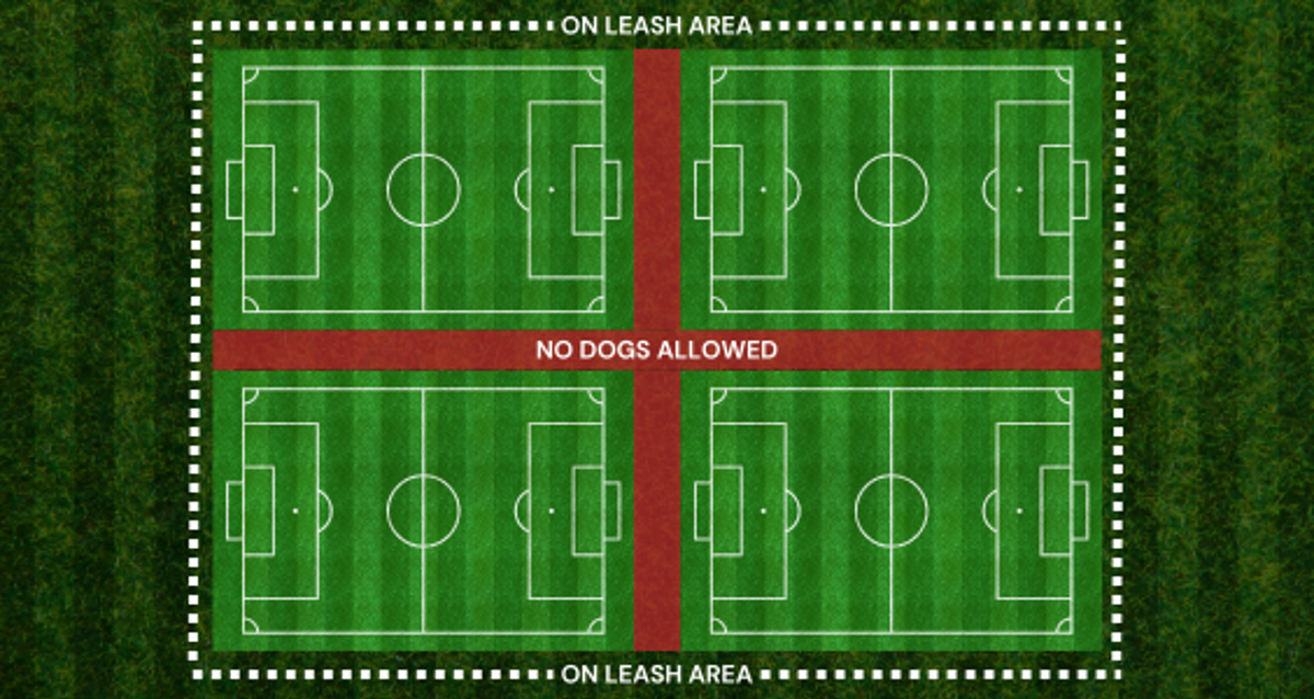 Dogs are allowed on-leash at sports grounds, but not on or between the playing fields. This helps keep our community's fields clean and safe.