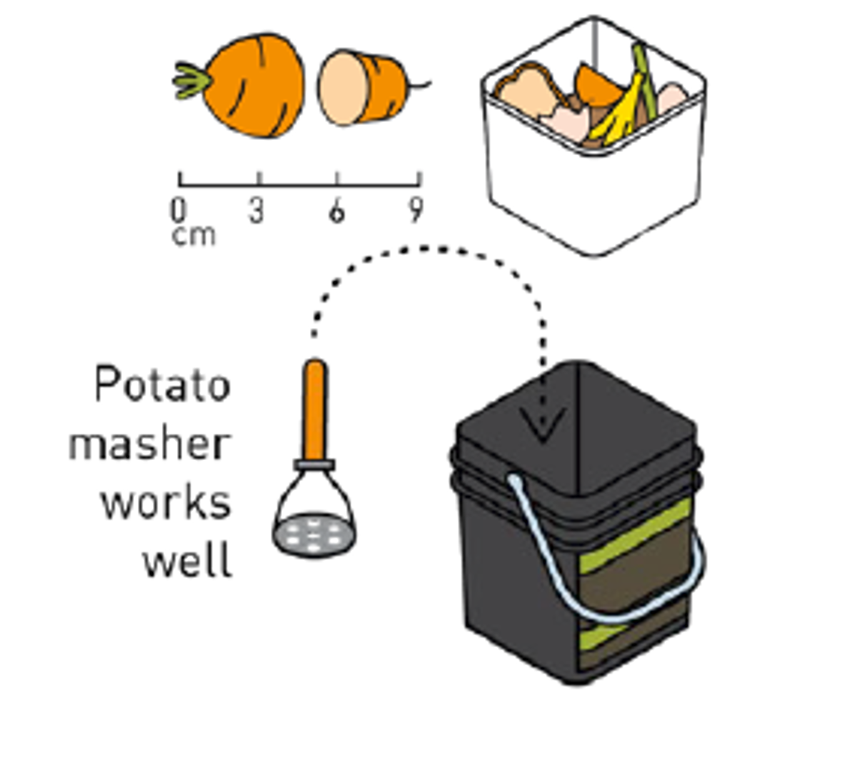 Chop your food scraps into pieces no bigger than a golf ball and store them in a bench-top container.