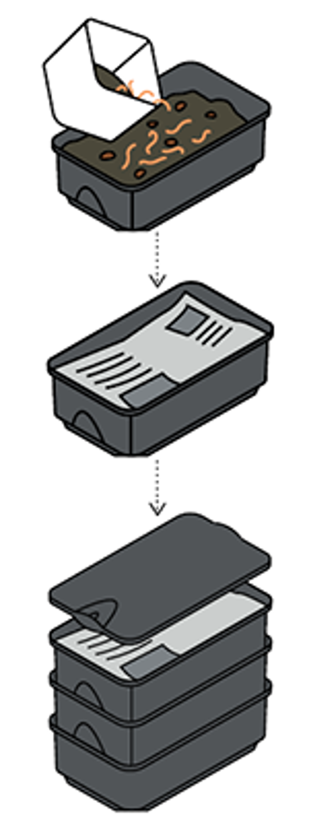 Worm farms use composting worms (eg, tiger worms) to eat through a mixture of food scraps, garden waste, paper and cardboard. Both the solids (castings) and the liquids (worm tea) make excellent fertilisers for the garden.