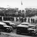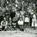 Caterpillar diesel bulldozer surrounded by a work gang, Centennial Highway, Paekākāriki, 1939 Hp 1031, J Beattie Collection, Kāpiti Coast District Libraries