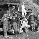 Work gang involved in constructing Centennial Highway, near Pukerua Bay, in 1938. Waterfall drainage systems were laid to prevent the highway from flooding Hp 1021, J Beattie Collection, Kāpiti Coast District Libraries